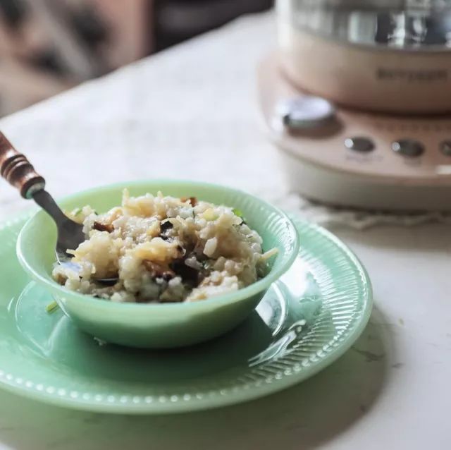 往粥里加一点冬菇和香菜碎,不仅可以让粥的颜色更漂亮,勾起孩子的食欲,更是增添了一丝清香。