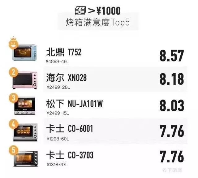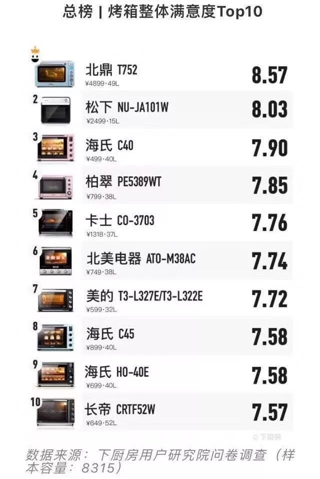这是来自下厨房用户研究院关于各烤箱满意度的调查问卷,北鼎7系烤箱稳居Top1: