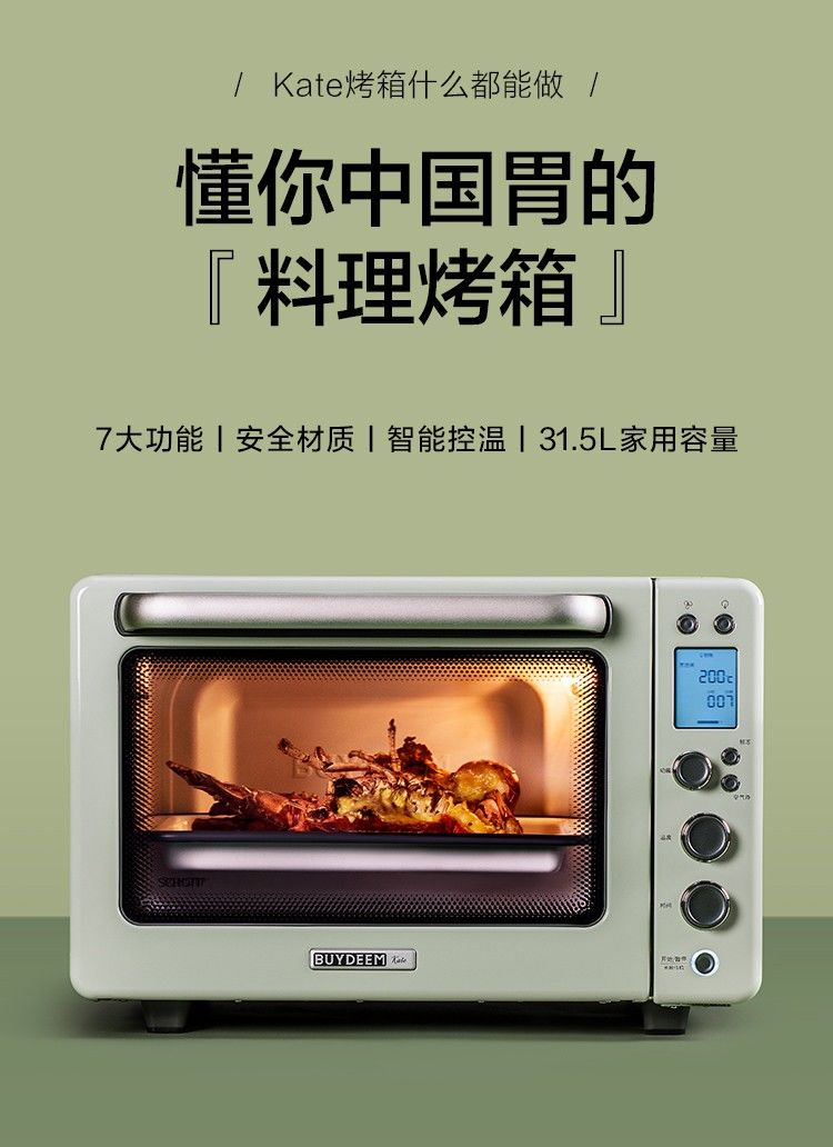 小kate是31.5L的容量,适合2-5口之家使用,可以烤两个6寸的戚风,或者15个蛋挞,10多个鸡翅,还可以烤一整只鸡~