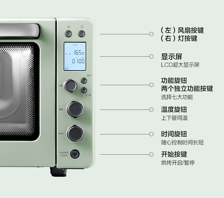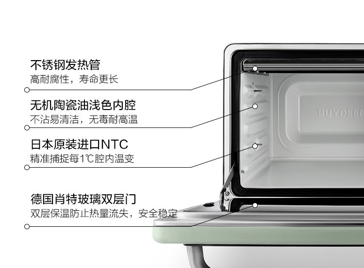 日本进口NTC感温探头,能精准捕捉烤箱内温变,双层肖特玻璃门和双层腔体,更能牢牢锁住腔内热量。