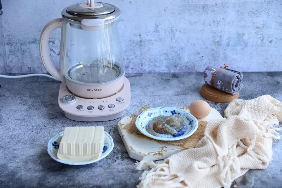 4.将打好的蛋液倒在豆腐上,放入炖盅,盖上盖子,养生壶加水至1000ml,放上炖盅,启动水果茶模式。