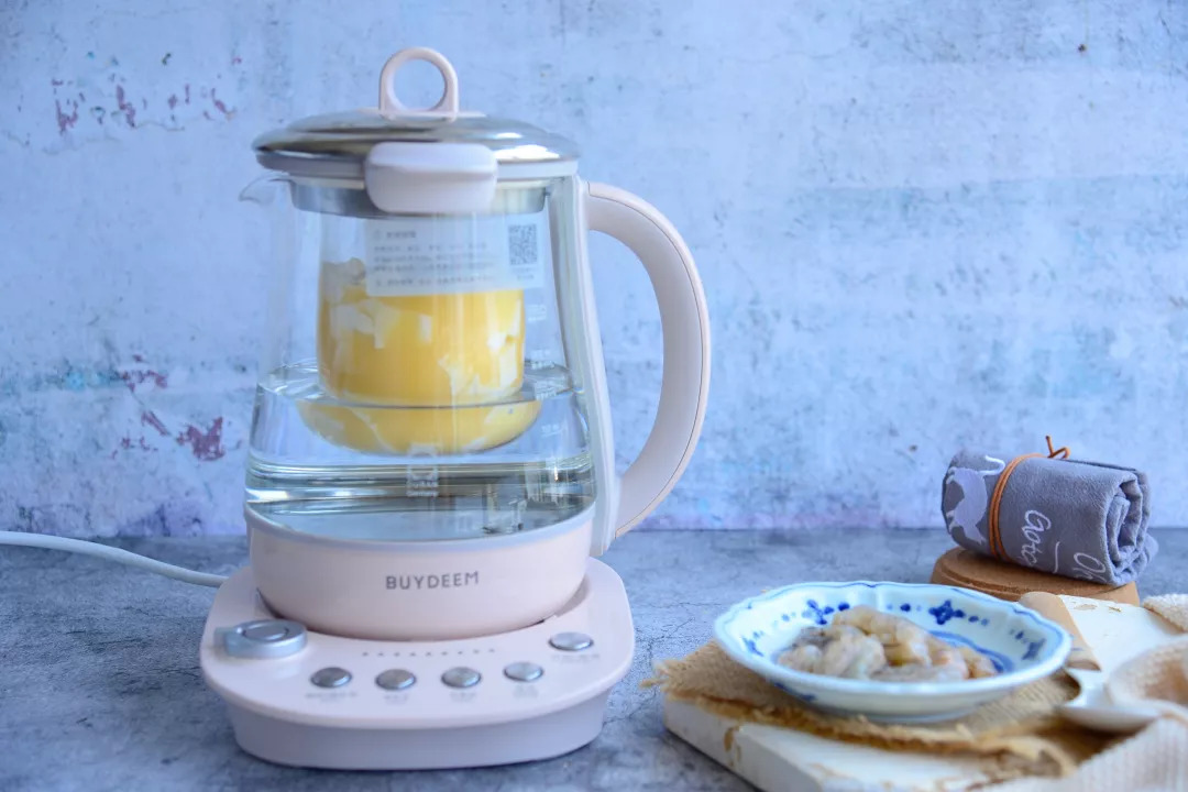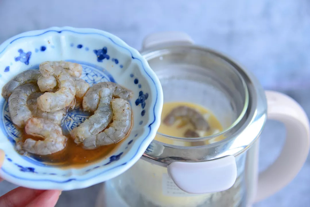 6.程序结束后,放上腌好的虾仁,再用水果茶模式蒸2分钟左右。