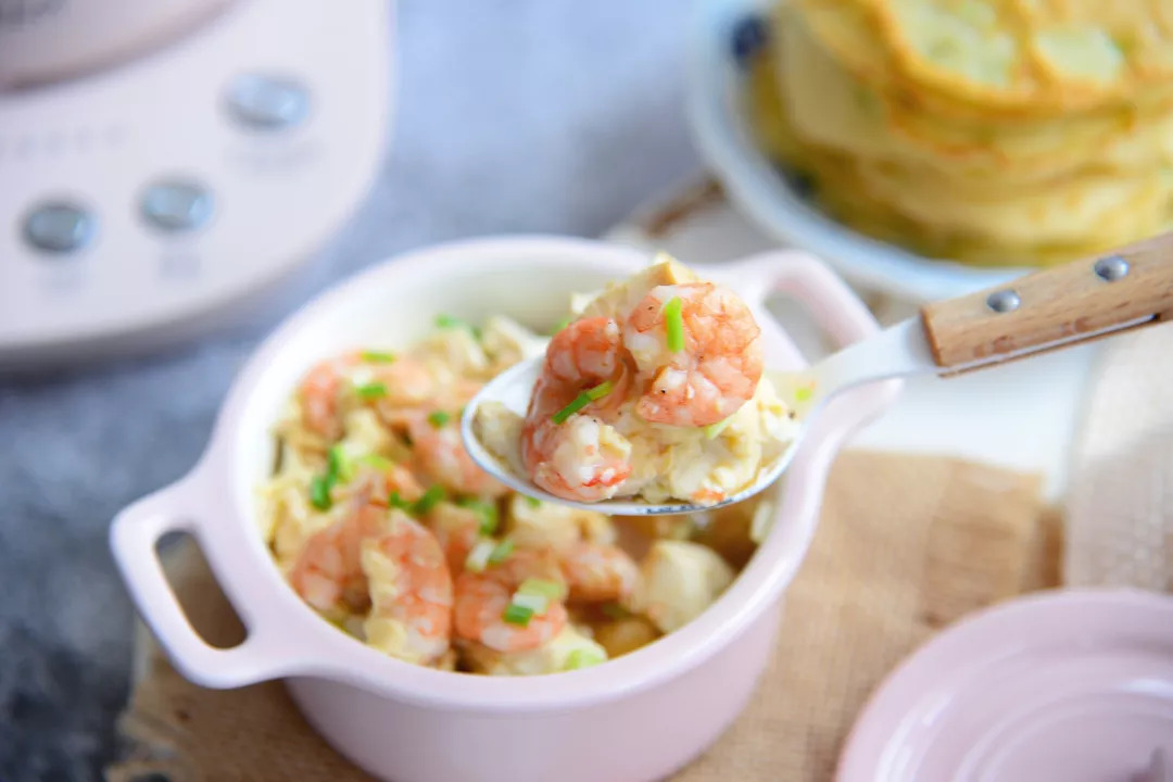 再加上一点鲜美的虾仁和嫩嫩的豆腐,把鸡蛋也变的更嫩滑,入口后没怎么停留就滑进了胃里,十足的美味~
