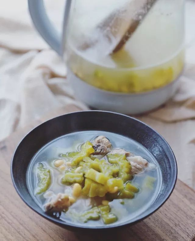 苦瓜黄豆排骨汤气味苦甘、清润,具清暑除热、明目解毒的功效,是兴梅一带夏日解暑的汤饮,亦常用以治疗感暑烦渴,暑疖,痱子过多等。苦瓜加黄豆排骨后鲜甜,黄豆粉粉的小孩也爱吃!