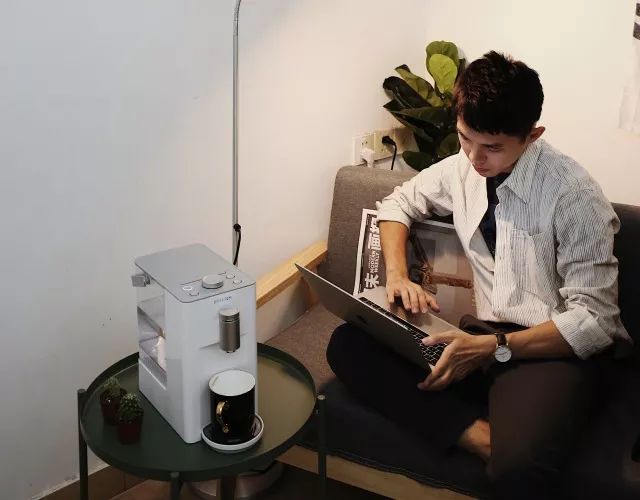 不同于传统的饮水机,这台水机占地只有A4纸的一半,放在办公桌上也不占位置。