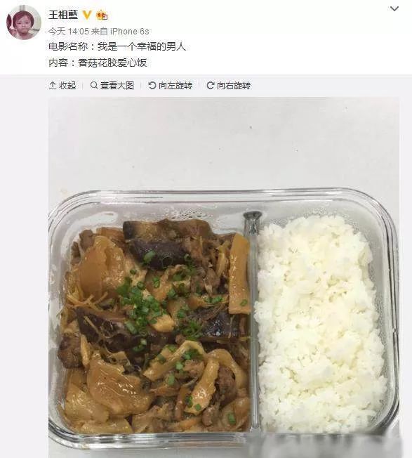王祖蓝微博曾发过老婆做的香菇花胶爱心饭。