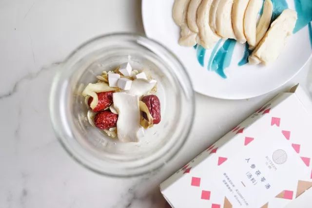 2.将食材包内的食材洗净,和鸡肉一起放入炖盅中,加水至炖盅盖下沿1厘米处。