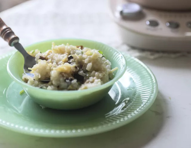 3.炖盅内放入洗净的大米、冬菇丁、干贝丝,加水至盖下沿1厘米处。