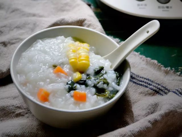 白米80g、胡萝卜20g、玉米2小段、青菜2小棵、姜2片、香油3滴、盐少许