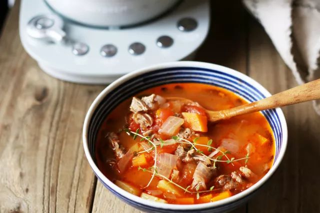 3.换一壶水,加入土豆、洋葱、胡萝卜、牛肉、适量番茄酱。