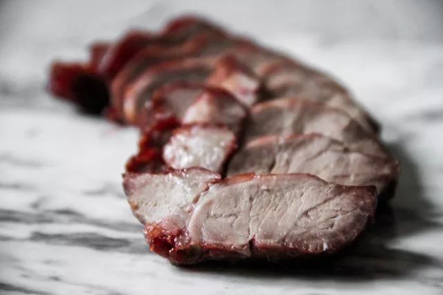 猪梅肉,广东人叫“梅头肉”,位置在肩胛骨的中心,可以说是整只猪身上最好的部位了,有肥有瘦还有筋。而且非常非常嫩,还不容易被烤老,一盘完美叉烧就靠它了。