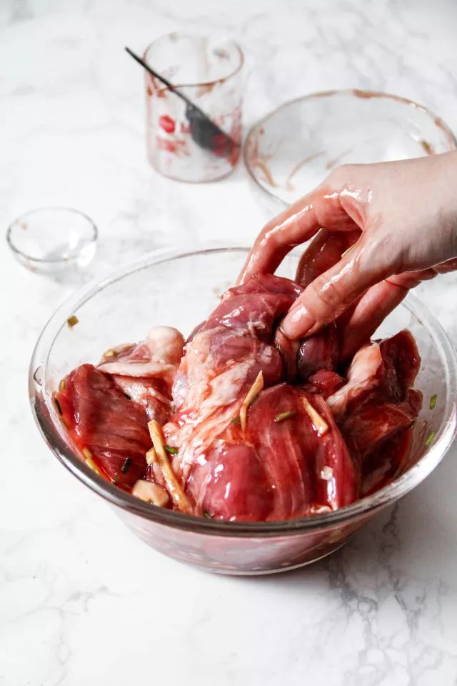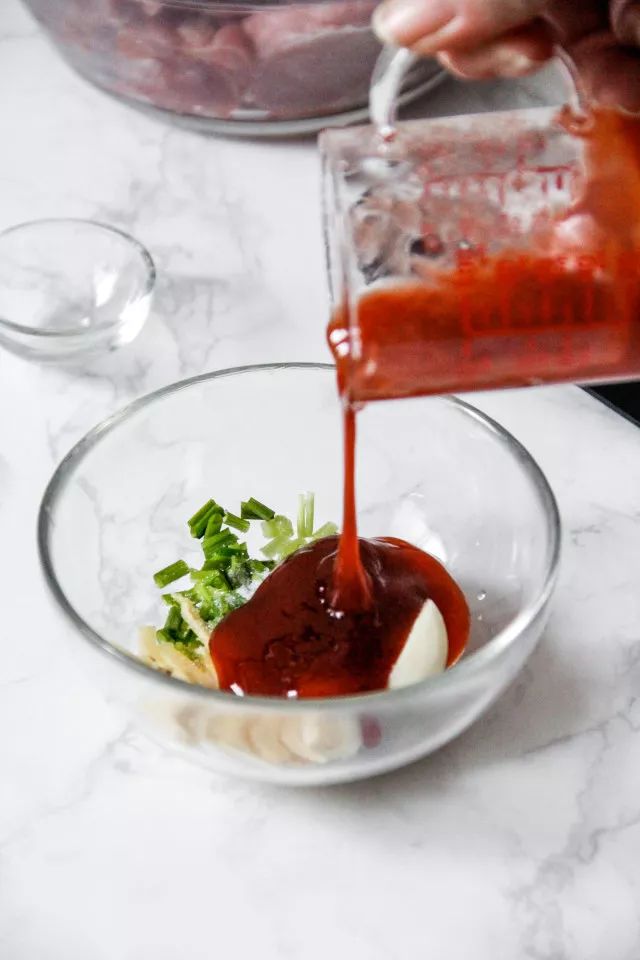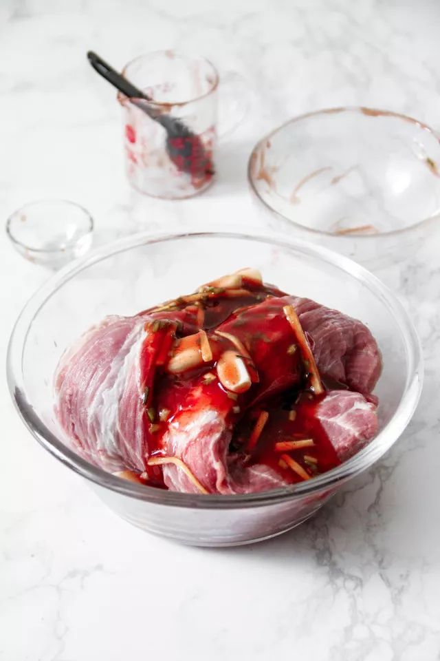 4.混合好的酱料倒入梅花肉中。