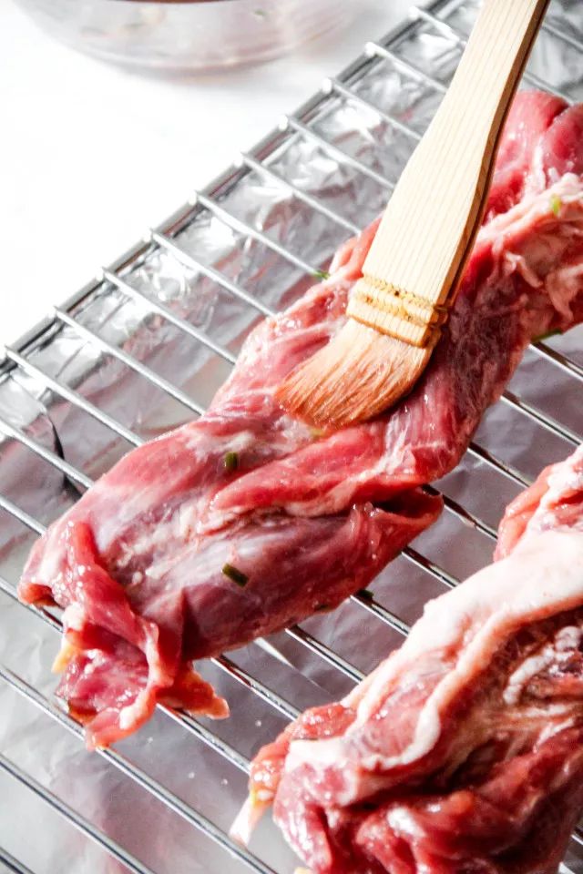 6.把梅花肉放在烤网上,刷上剩下的酱汁。