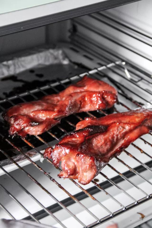 7.上下火190度,烤20分钟后翻面,再刷一次剩下的酱汁,接着烤20分钟后再次翻面,刷一层叉烧酱,继续烤10分钟即可,共50分钟。