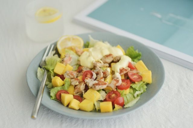 5、最后把烤好的鸡胸肉铺在芒果和蔬菜上面,淋上2大勺自己喜欢的沙拉酱