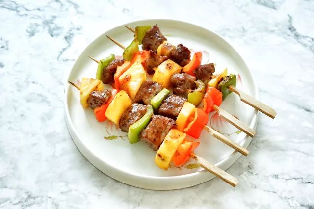 3、竹签需实现在水中浸泡10分钟,串起青红椒菠萝和牛肉,架在烤碗上。也可以直接放在烤架上烤,但是这样清洗烤架比较麻烦,所以我架在了烤碗上