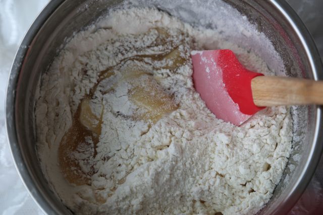 3. 加入过筛两次的面粉和吉士粉.用刮刀轻轻搅拌.搅拌均匀后用保鲜膜密封好.放室温松弛三个小时以上。