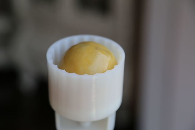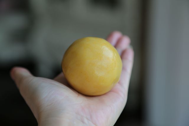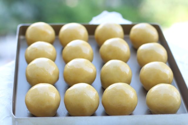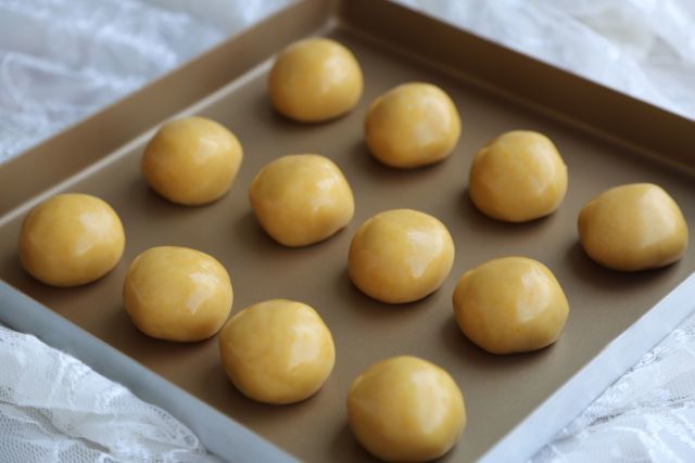 1.咸蛋黄喷上高度白酒后,不需要先预热北鼎烤箱,150度中层烘烤八分钟出炉晾凉,然后和莲蓉馅一起称重55克包好备用。