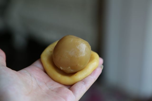 5.把馅料放在压好的饼皮上,用手指慢慢推饼皮最后完美封口。把包好的月饼球轻轻揉均揉圆。然后直接放到模具里均匀的轻轻压平、脱模。