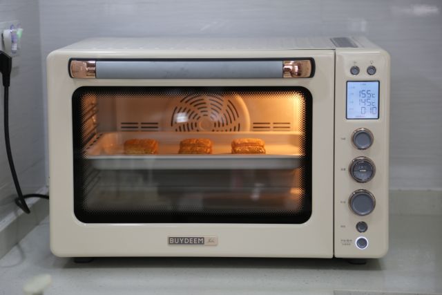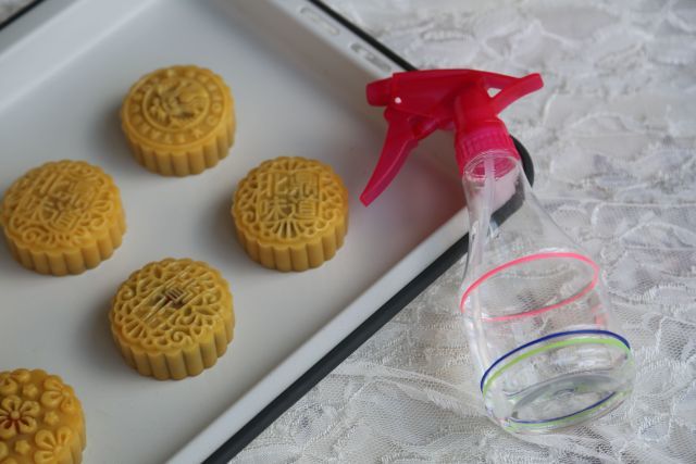 6. 北鼎烤箱预热200度.在月饼表面轻轻喷一层水,入烤箱。中层上火200度,下火180度,6分钟。