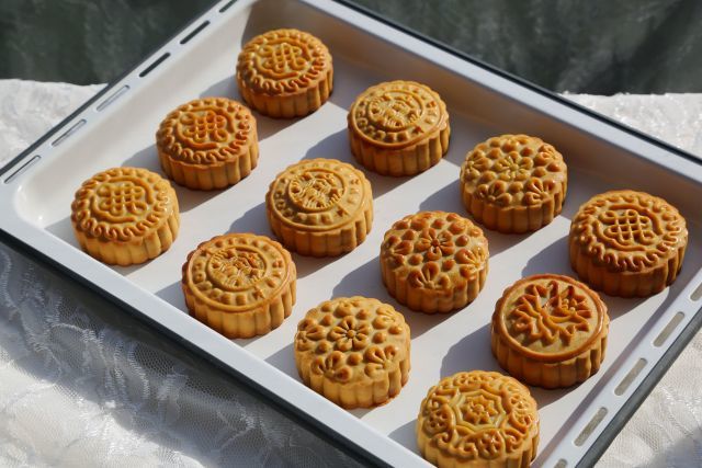 9. 取出烤好的月饼.完全冷却后,然后放到密封好的容器中回油.(最好的回油时间就是 48小时)。