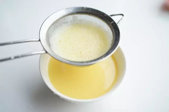 2.鸡蛋打散,加入少许水和盐,将蛋液过筛,去除浮泡。