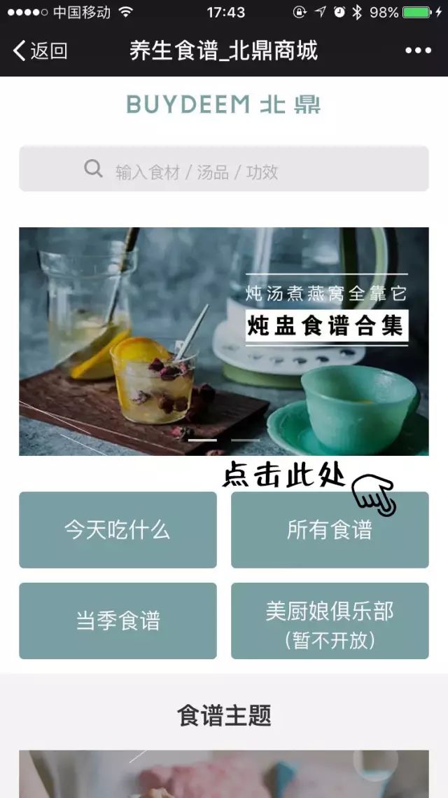 第一步,打开公众号【北鼎BUYDEEM】,在菜单栏处点击【查食谱】。