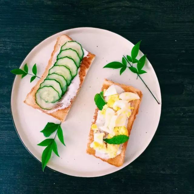 如果想清爽一点,将青瓜切片铺在吐司上,挤点沙拉酱,如果想补充蛋白质,可以将水煮蛋切块,铺到吐司上,配上一杯牛奶,放心,大口咬下去,元气满满,还不长肉!