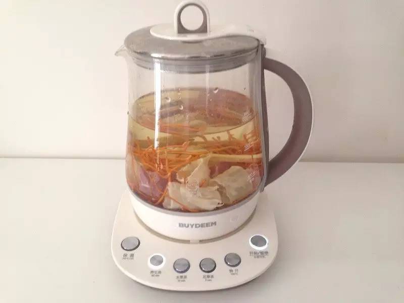 ▼将花胶、虫草花、瘦肉一起放入养生壶内,加水至1200ML左右,启动养生汤。