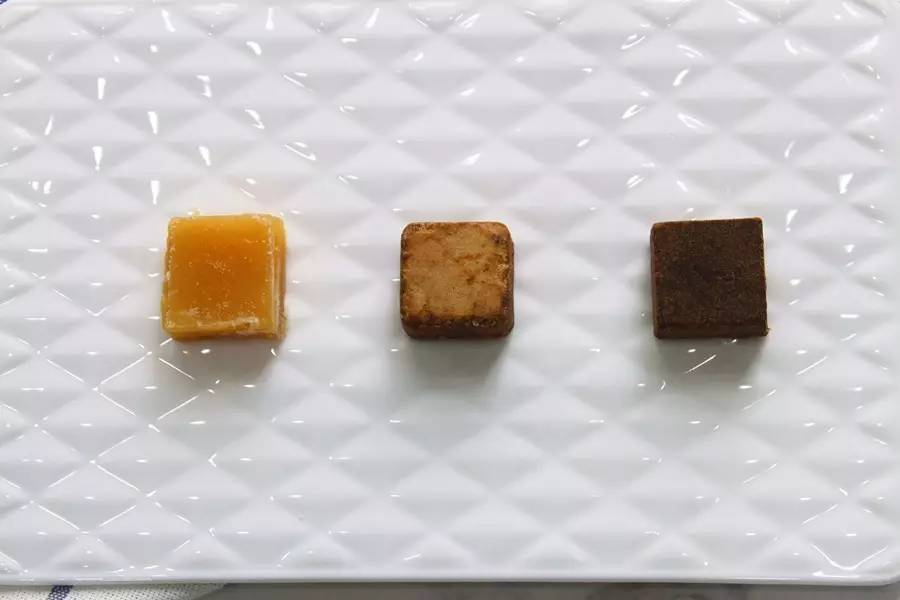 ▲ 从做至右,糖块的颜色逐渐加深。这三块黑糖分别来自农批市场、淘宝和原产地。按正常来看,黑糖应该呈现深咖色偏黑色。第一块外包装上写着红糖,但配料表里明确显示为赤砂糖,其颜色也明显不是黑糖;而中间那块虽然颜色较深,但不均匀,深浅不一,值得怀疑;最右那块颜色较为正常。