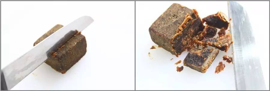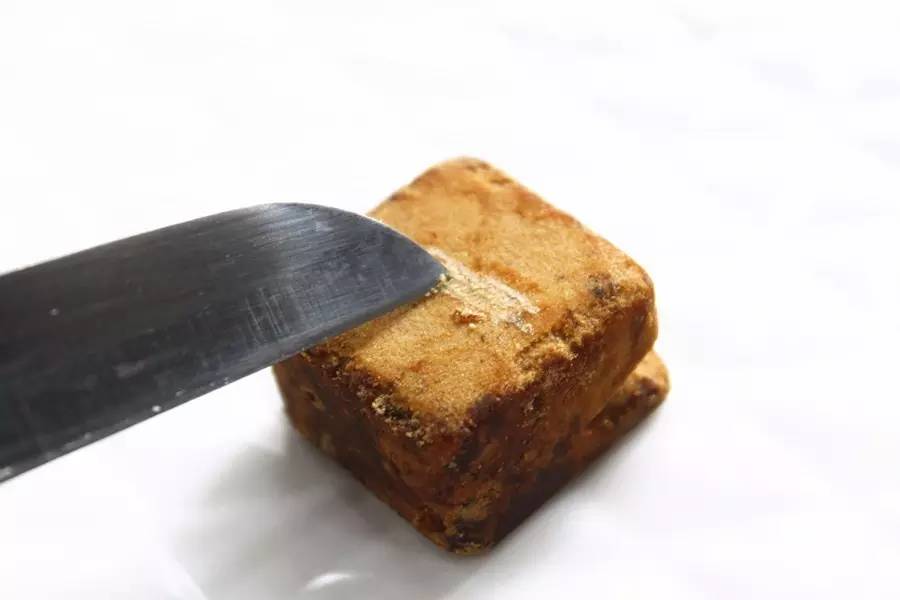 真的黑糖虽然硬,但一刀切下很容易切开,你会发现刀触如沙般柔软。但是假黑糖,就非常难切开。