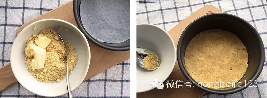 ▼ 烤好的挞皮(或者消化饼)弄碎;方法:隔着保鲜袋用擀面杖压,也可直接用料理机打碎。加入软化好的黄油,拌匀后,平铺在垫了油纸的模具底;