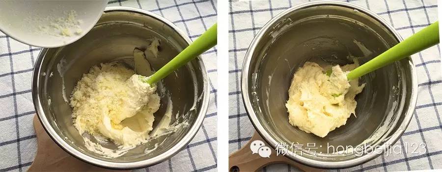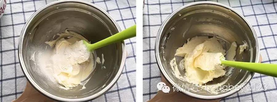 ▼将低粉筛入奶油奶酪中,搅拌均匀备好;