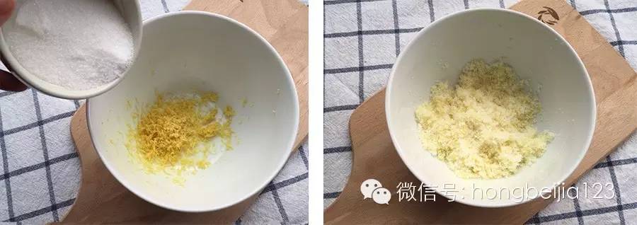 ▼ 接着将白砂糖倒入柠檬皮屑中,用手轻轻揉搓柠檬皮屑和砂糖,使两者混合均匀、散发出浓郁的柠檬香气;这步真的不是工具能代替的,一定记得上手直接搓,更有香气;