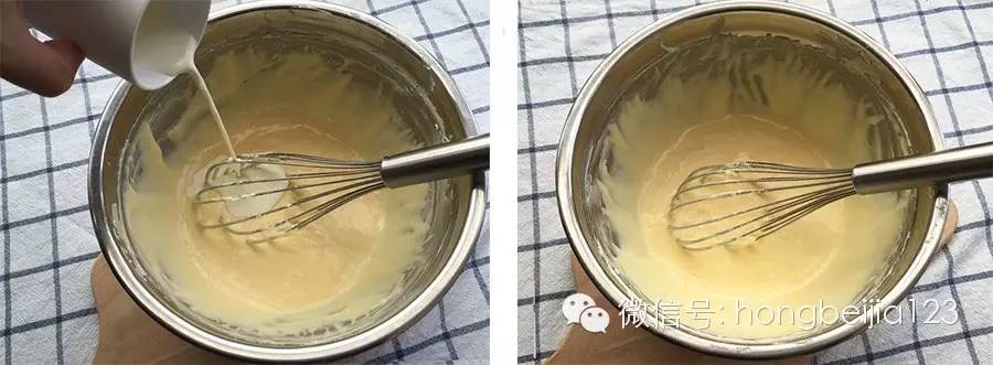 ▼接着分3~5次加入鸡蛋液,每次加入都要搅拌均匀再加下一次,一旦搅拌均匀就停止,不要过度拌和;