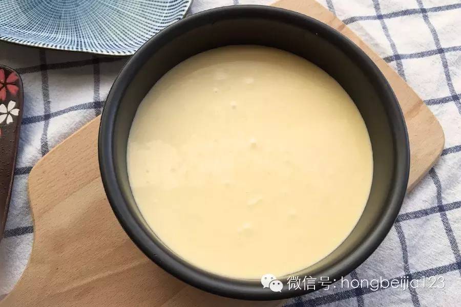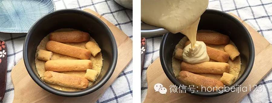 ▼将手指饼平铺在饼底上,倒入全部奶酪糊;