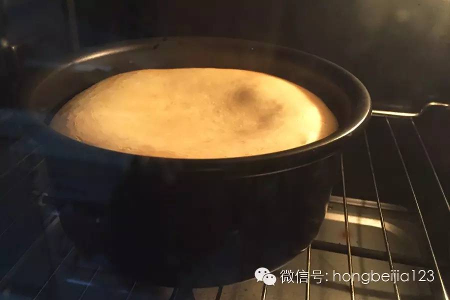 ▼入烤箱,烘烤40分钟左右,待蛋糕表面上色成金黄、轻轻摇动模具,看到蛋糕中心有微微颤动(但不是很明显的波纹),就好了;根据各人烤箱情况不同,这个时间仍然需要自己把握以下,35分钟左右就需要开始观察;