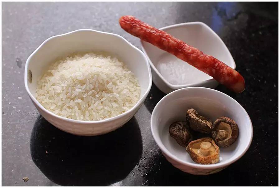 ▼食材提前处理:大米淘洗后,浸泡四小时左右;干香菇洗净后,用温水泡软后切丁,香菇水留用勿丢;腊肠大部分切斜片,一小部分切丁。