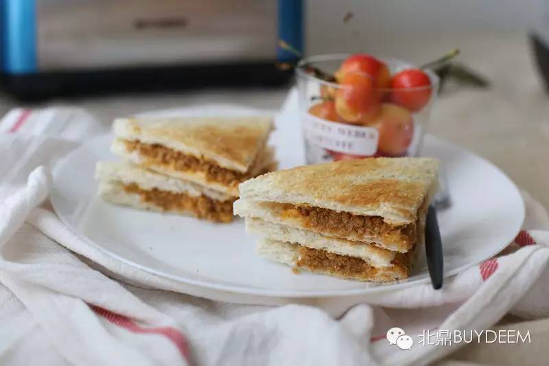 4.将另一片烤好的吐司片盖在上面,切成三角形,开吃!