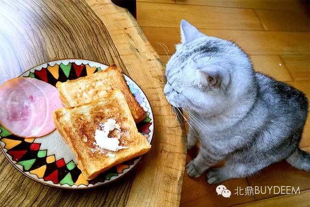 2.趁热在面包片抹上奶酪,配上火腿片,喵喵也想吃!