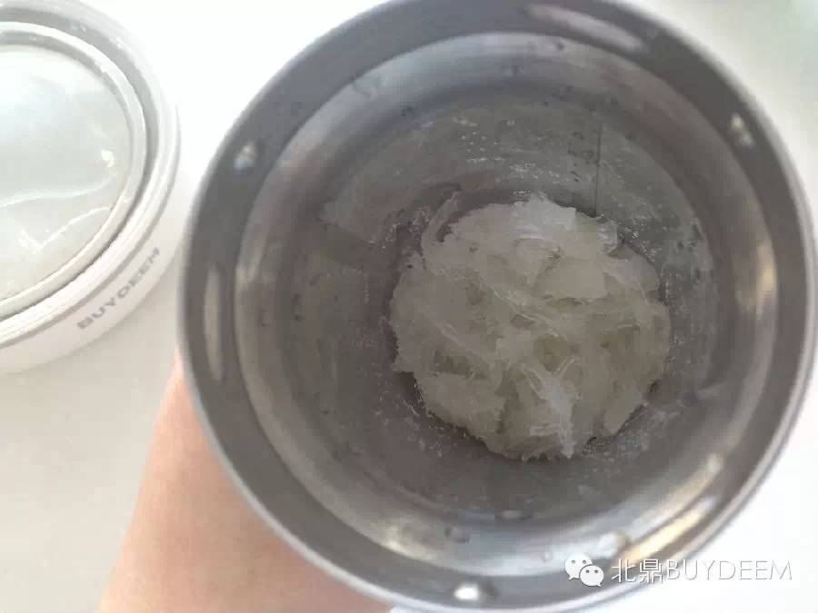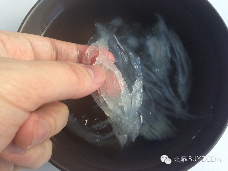 1、燕窝洗净表面,放干净碗里隔夜浸泡,燕窝完全发大至通透,如有细小的绒毛用镊子挑出。