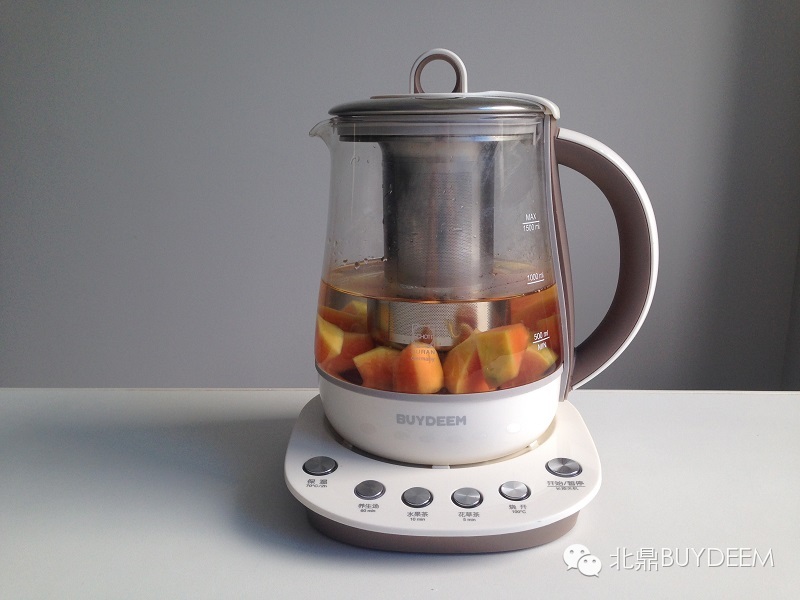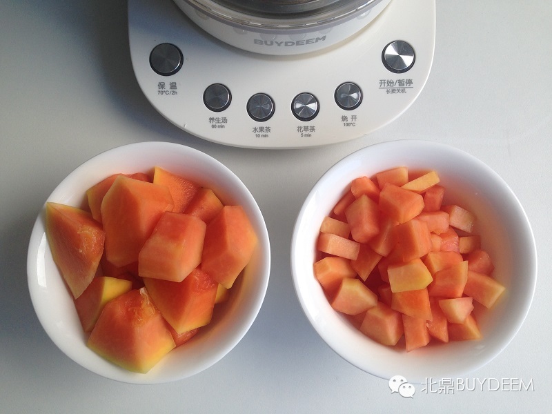 4、将大块的木瓜放入北鼎养生壶,盖上装好茶篮的壶盖,加水至800ML左右,启动养生汤模式。