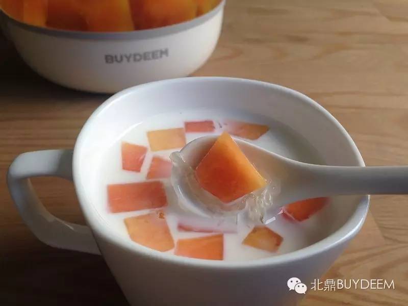 6、加入牛奶和小块的木瓜,根据自己的口感加入适量砂糖或者蜂蜜,搅拌均匀,即可食用。