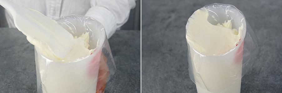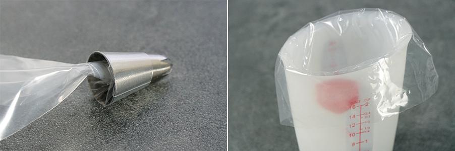 2、将裱花袋靠近嘴的部分旋转几下,压进裱花嘴中(这是为了防止装填过程中填充物从剪口处漏出);再将裱花袋装入大小合适的杯中,多余的裱花袋反折出来;