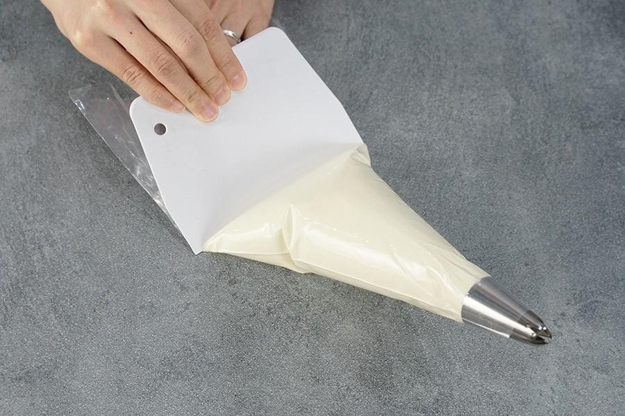 4、将裱花袋反折的部分翻回,提着两边抬起裱花袋,放在桌子上;松开裱花嘴处扭起的裱花袋,把肉眼能看见的袋中的大泡隔着袋子轻压推出;用刮板隔着裱花袋将填充物推压到前端,直到填充物从裱花嘴中冒了个头;注意:填充物不能超过裱花袋体积的2/3。