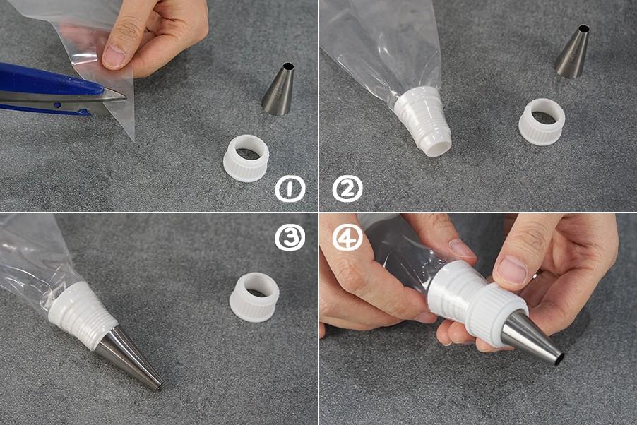 剪口后装进转换器底座;裱花嘴从外面套上底座,套上转换器的头,旋紧。