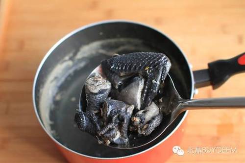 取乌鸡100g切块,焯水5~6分钟后捞出;