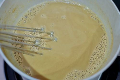 牛奶和细砂糖加入奶锅中,用小火煮至沸腾后熄火,加入浓缩咖啡粉搅拌