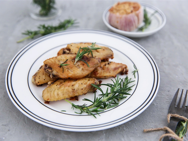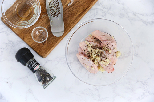 鸡翅放入大碗,加入植物油和蒜蓉,再加适量的盐和现磨黑胡椒,带上一次性手套,反复揉搓按摩鸡翅使之入味;