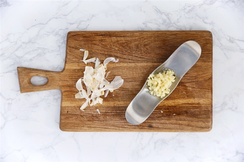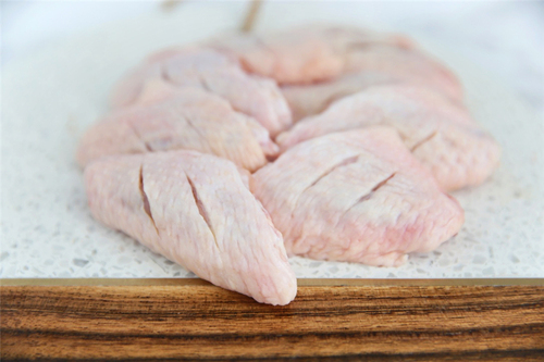 鸡翅洗干净,用厨房纸巾吸干水分,划几刀备用;蒜瓣去皮,压成蒜蓉;